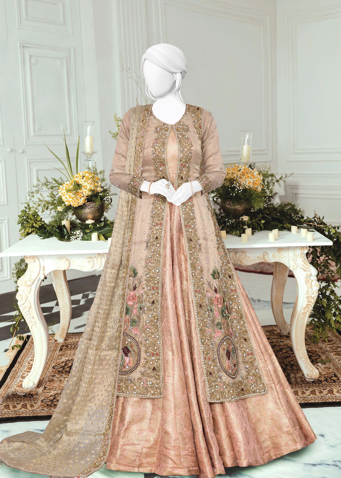 This pink gown is made of net and kundan zari, with beautiful embroidery using dabka, moti, sitara, and thread. The maxi style with a tailed gown gives it a classy look, and the net dupatta adds a touch of charm. It's a perfect mix...