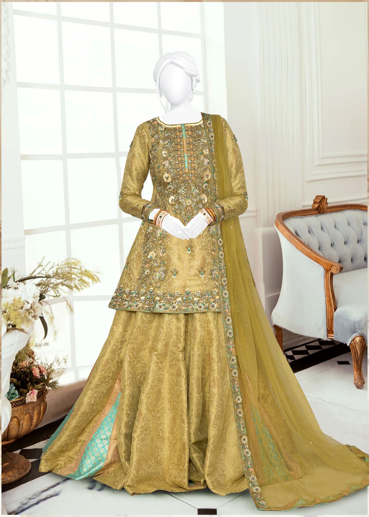 This outfit has a flowy ghagra and kurti made of net and pure jamawar. The net dupatta is decorated with golden, aqua green, peach colors, along with moti, sitara, dabka, and champagne moti. It's an elegant choice for special occasions, blending traditional and modern...