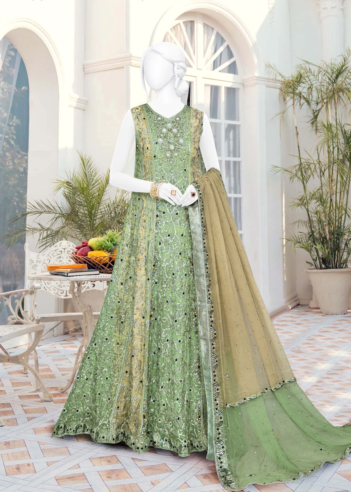 This stunning maxi dress comes in a soothing pista green and fawn color made from pure chiffon. The kuti naqshi detailing is beautifully enhanced with bottle green and white stones, adding a touch of elegance. The full-length tail style of the maxi completes the look, making it a perfect choice for a graceful and stylish appearance at any special occasion.