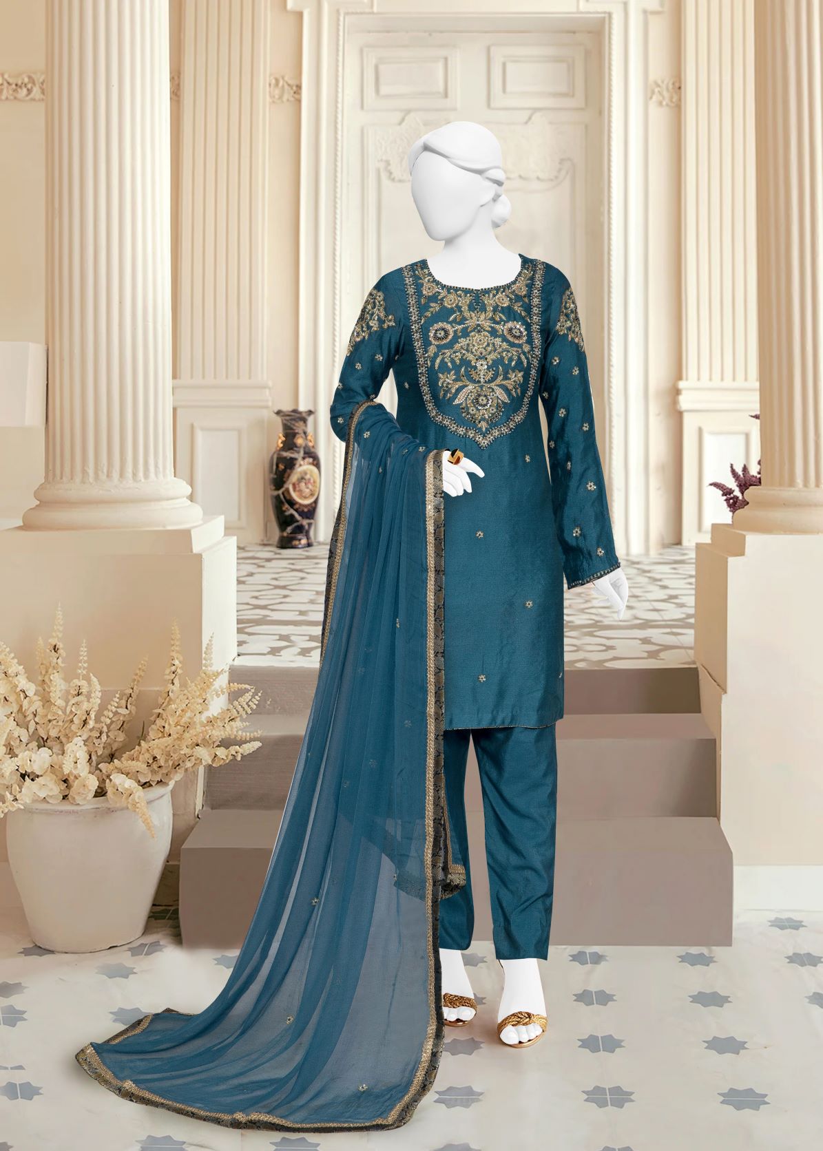 This stylish ensemble features a cotton net shirt paired with a row silk trouser, and a chiffon dupatta adorned with a four-side lace and jamawar patti. The charming design is intricated by moti, sitara, and dabka work adding a touch of elegance. The lovely zinc color enhances the overall appeal, making it a comfortable yet chic choice for any occasion.